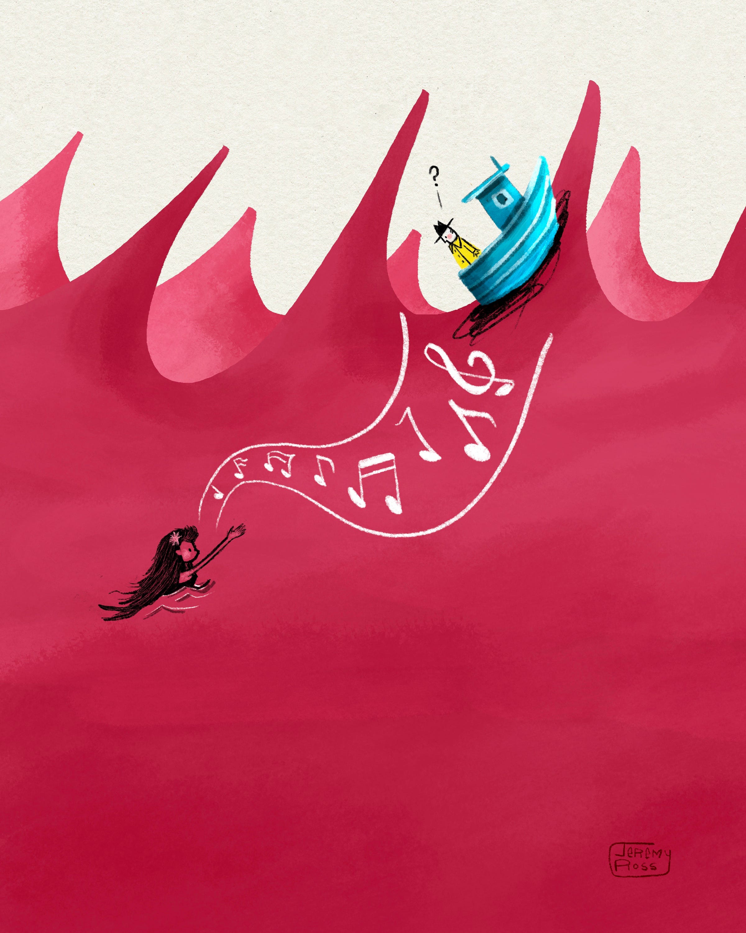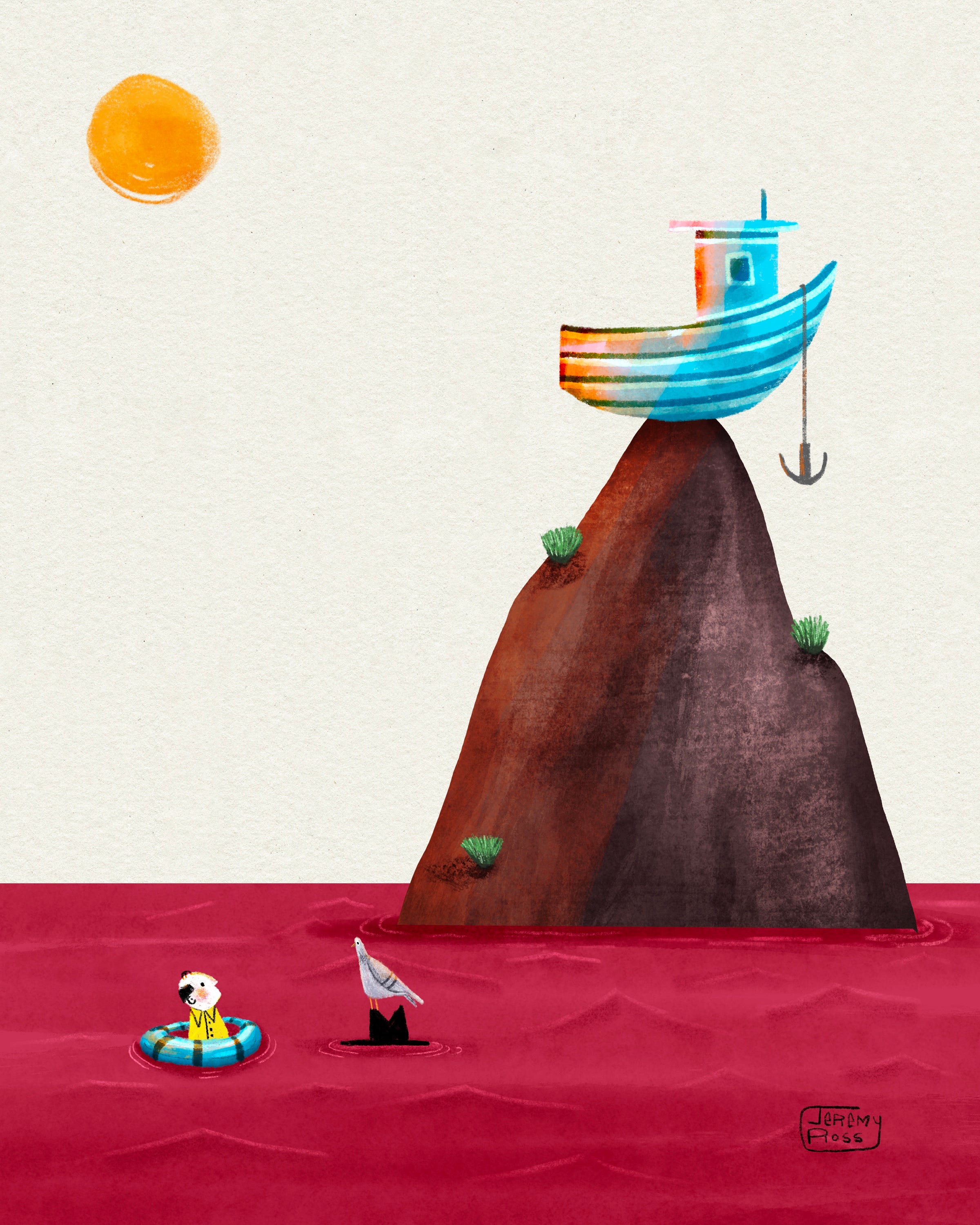Not long after setting sail, the red waves angrily rose with aggression. His tiny boat seemed unbothered as it rose and fell with the crimson walls.